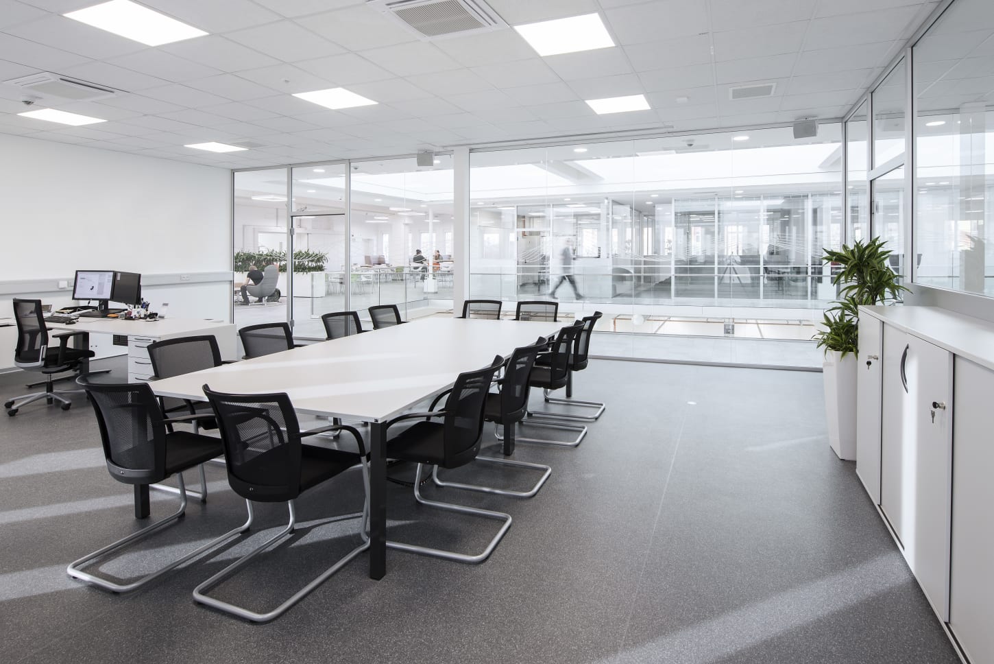 “Rund um das Atrium im Obergeschoss platzierten wir die Büros für Forschung, Entwicklung, Beschaffung und Disposition, sagt Josef Reil von der R² Bürodesign GmbH. "Alle 60 Arbeitsplätze gestalteten wir ergonomisch und teilweise mit dem höhenverstellbaren Tischsystem TALO.S sowie Bürostühlen der JET-Familie. Als Stauraum dienen Schränke des ACTA.CLASSIC Programms. Die drei Konferenzräume, die bei Bedarf zu einem großen Raum zusammengelegt werden können, statteten wir mit OKAY.II Drehstühlen und dem funktionalen BASIC.4 Tischsystem aus.”