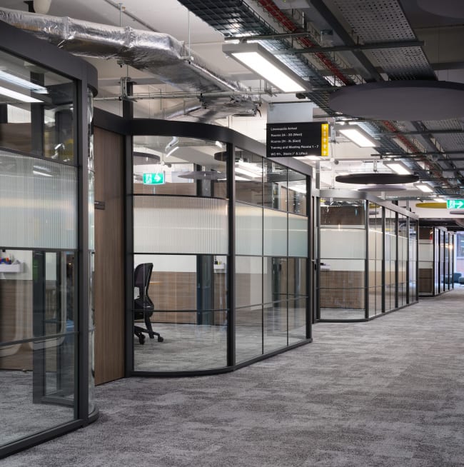 Die eingesetzten Systeme definieren Raum neu – als transparentes, funktionales und atmosphärisches Element. Sie kommunizieren visuell miteinander und machen komplexe Anforderungen an Rückzug, Zusammenarbeit und Technik elegant erlebbar.