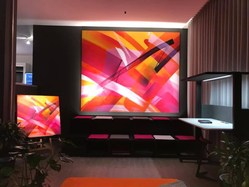 Was die Innenarchitektinnen besonders freut, ist neben der geglückten Abbildung ganz unterschiedlicher Arbeitswelten die Integration von Elementen, die für die Umgebung charakteristisch sind. „Wir wollten unbedingt etwas, das unverwechselbar für den Berliner Charme steht, und sind stolz, dass wir die Streetart Künstlerin Claudia Walde aka MadC dafür gewinnen konnten, mit uns zusammen zu arbeiten.“ Eines ihrer Werke ist als akustisch wirksames Bild auf einer stattlichen Fläche von knapp acht Quadratmetern im Showroom zu bewundern.