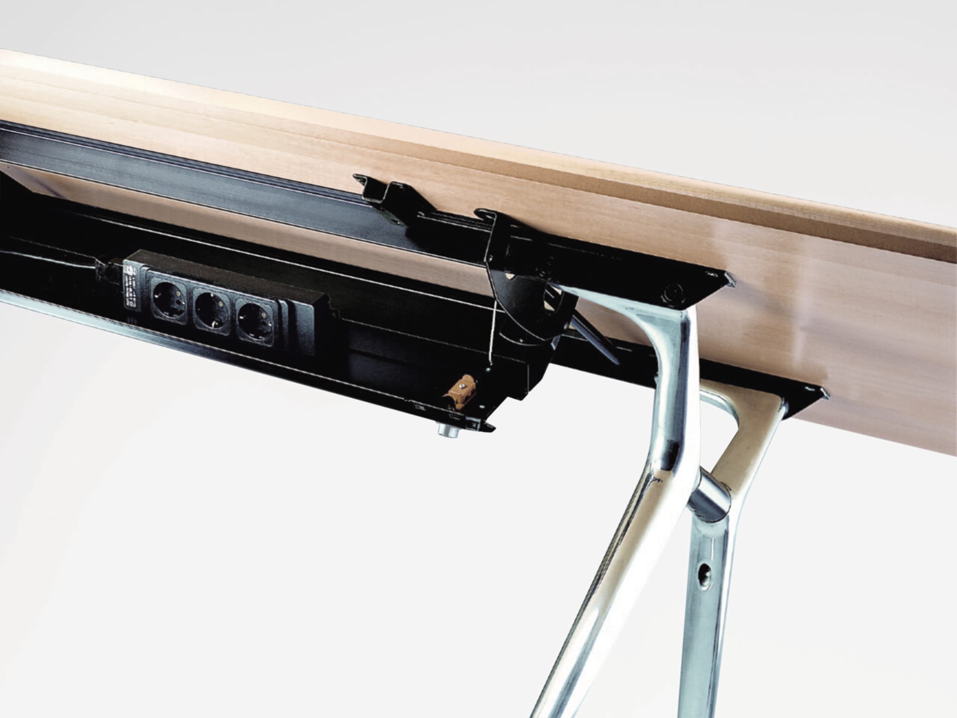 Leitungen verschwinden unter der Tischplatte und ermöglichen trotzdem einen direkten Zugriff.