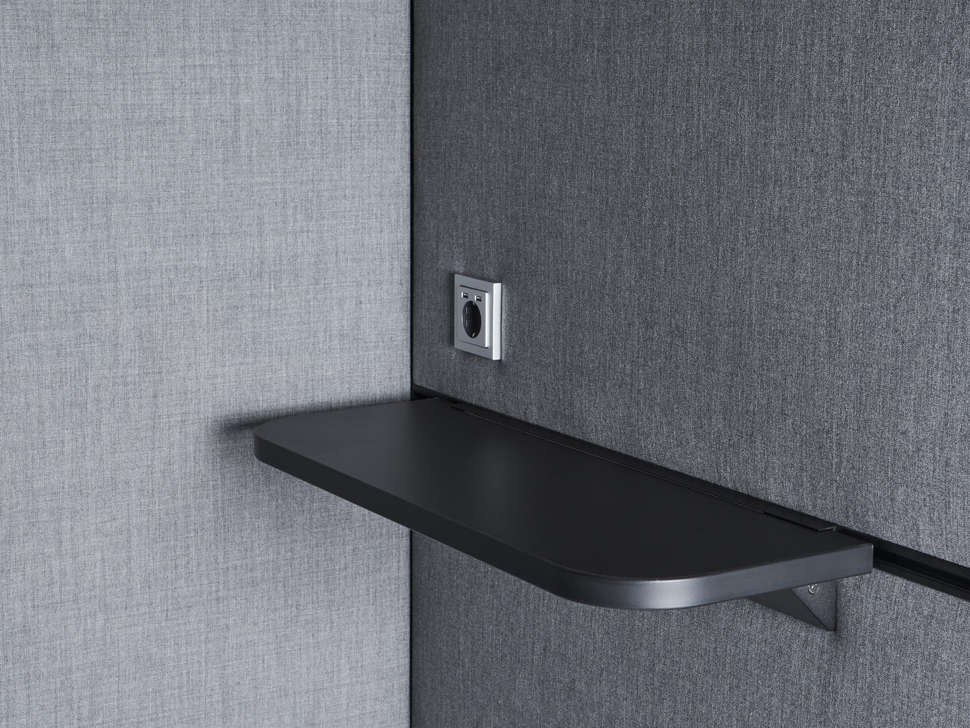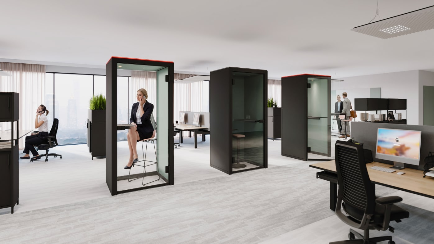 With the TALK.BOX, we now offer a second room-in-room solution for undisturbed telephoning. It, too, takes up almost only one square metre of space, but effectively helps to reduce the background noise in the office. With its profiles made of black, sustainably produced aluminium, the TALK.BOX looks extremely elegant and is available in two design variants (clear, angular design language and organically rounded corners). Choose between different surfaces and textile interior coverings and let yourself be surprised by numerous sophisticated equipment options.