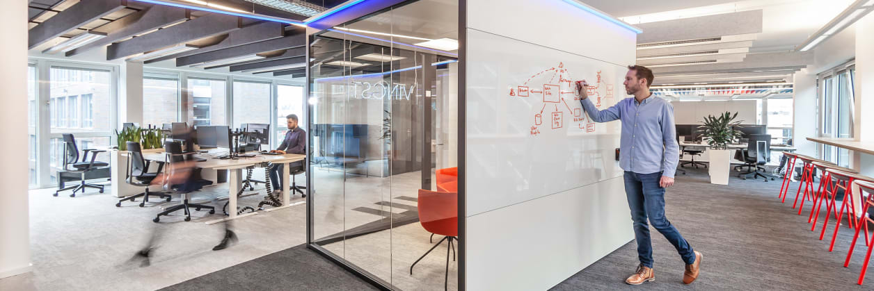 Le monde du travail flexible, dans lequel le travail de projet, les voyages, le home-office et les outils de concertation numériques font partie du quotidien, permet de gérer l'espace de manière systématiquement différente qu'auparavant. De nombreuses entreprises choisissent d'adapter leurs espaces de bureau de manière variable à l'évolution des besoins - et de réduire ainsi les coûts. Contrairement aux bureaux paysagers classiques, König + Neurath aménage les surfaces de manière flexible et modulaire en fonction de la culture de travail - et les zonent en fonction des besoins avec des systèmes d'aménagement de différentes tailles et versions. Notre offre de systèmes d'aménagement va du système de cloisons en verre HORIZONTE à la solution de réunion représentative THINK.TANK, en passant par les cloisons INSIDE.50 pour un travail concentré, la cabine téléphonique QUIET.BOX ou le confortable INSIDE.CUBE pour les entretiens.