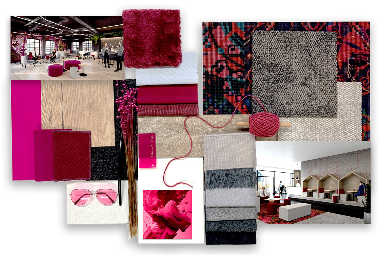 En tant que couleur sombre, Viva Magenta favorise à la fois la concentration et l'échange créatif. Elle maintient l'équilibre entre activité et calme et peut donc donner des impulsions subtiles dans les espaces de collaboration qui invitent à la collaboration. Carolina Meseguer Girbés : "Cette couleur est sûre d'elle, mais pas agressive. Elle peut donc être utilisée pour décorer les murs, les meubles rembourrés et même comme composante du sol". Même si des éléments absorbant le son ou des séparateurs d'espace sont utilisés pour séparer des zones, ils se prêtent à attirer le regard et à créer des accroches activantes.