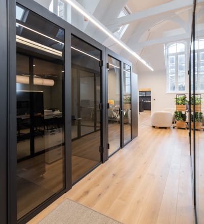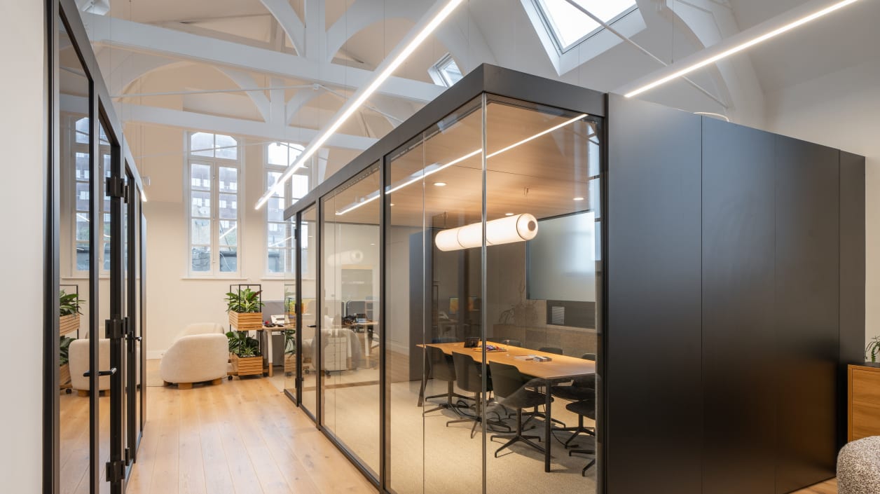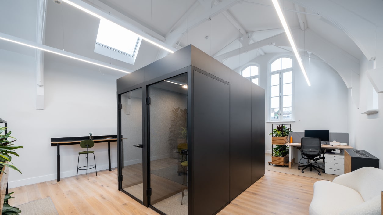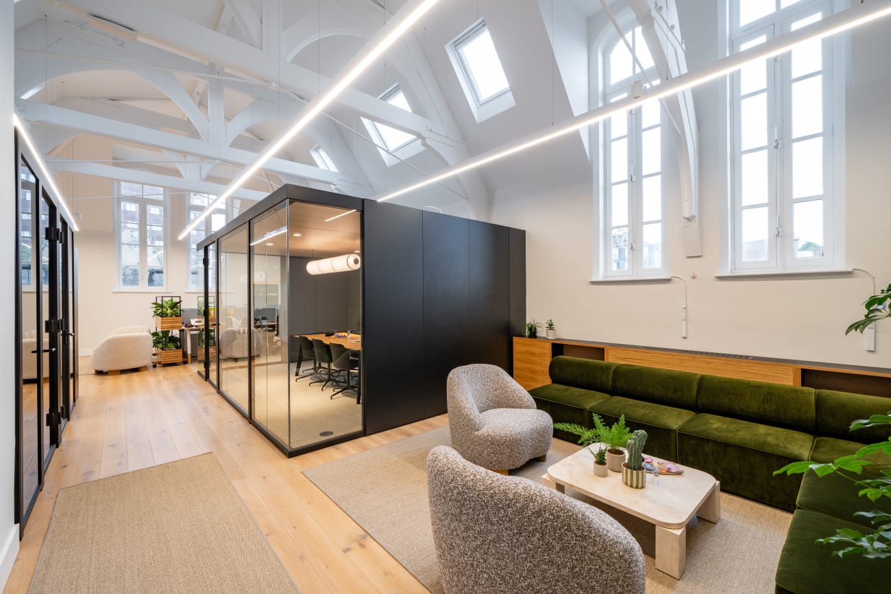Les solutions « espace dans l'espace » s'intègrent harmonieusement dans l'ensemble architectural : les profilés noirs forment un contraste élégant avec les murs clairs, les sols et la lumière naturelle qui pénètre par les grandes fenêtres cintrées. Le résultat est un environnement de travail de caractère, ouvert, calme et propice à la concentration.