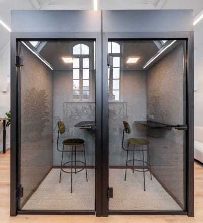 C'est précisément dans l'environnement sensible d'un bâtiment historique que nos solutions autonomes « espace dans l'espace » ont démontré leur force sans intervenir dans la structure du bâtiment. Pour une, trois ou huit personnes, elles offrent un espace propice au travail concentré, aux conversations confidentielles ou au travail d'équipe collaboratif. Si les besoins changent, les cubes peuvent être démontés et replacés. Cela a non seulement créé de nouvelles possibilités d'utilisation, mais a également permis de préserver le caractère architectural du bâtiment.