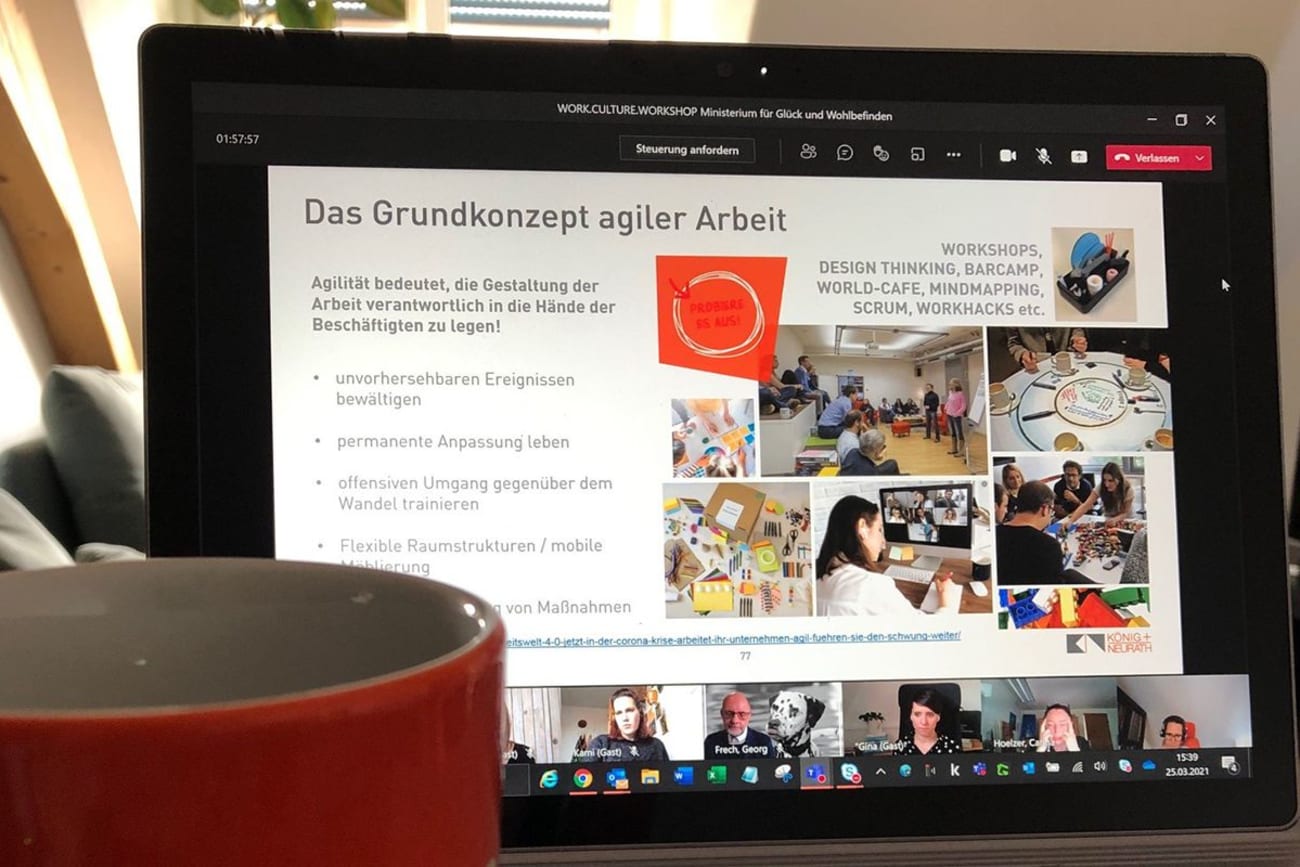De eerste stap op onze gezamenlijke weg was een workshop die een König + Neurath team met het team van het geluksministerie organiseerde. Met onze WORK.CULTURE.MAP analyseerden wij de werkcultuur van het kleine team en deden aanbevelingen voor een passende werkomgeving. Als volgende stap staat de praktische uitwerking ervan gepland. Tegelijkertijd levert Gina ons belangrijke impulsen op het gebied van arbeidscultuur – en hoe wij geluk en tevredenheid nog meer ruimte bij König + Neurath kunnen geven.