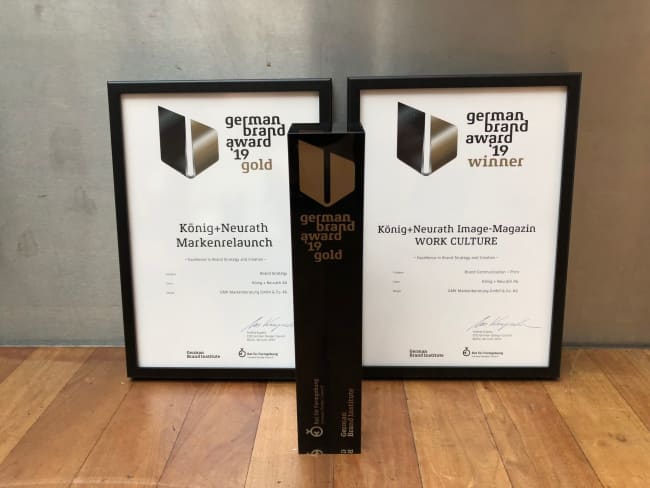 In de categorie “Brand Creation – Print” werd het imago-magazine als winnaar aangewezen. Het tijdschrift presenteert op levendige wijze de nieuwe merkpositionering en werpt een veelzijdige blik op het thema ‘arbeidsculturen’. Het tijdschrift biedt een inkijkje in de geschiedenis en de attitude van ons familiebedrijf en maakt het merk König + Neurath op veel niveaus ervaarbaar. Wij zijn zeer trots dat wij met onze ontwikkeling van productiegericht bedrijf naar oplossingsgericht merk niet alleen dag in dag meedenken met onze klanten, maar ook de jury van de German Brand Awards maar liefst tweemaal hebben kunnen overtuigen. Bijzonder emotioneel is voor ons het interview met Egon König over de geschiedenis en de toekomst van König + Neurath als familiebedrijf.” aldus Carl-Christoph Held, die daarmee de blijdschap van het hele team verwoordt.