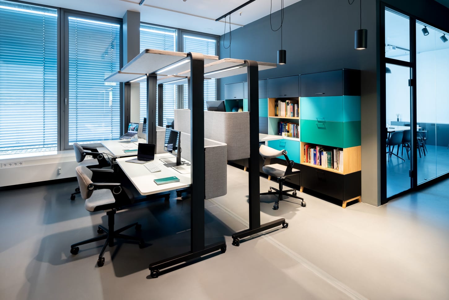 Bewust heeft iedereen zijn vaste werkplek, die binnen het kantoor een gevoel van ‘thuis’ biedt en identiteit verschaft. Bovendien profiteren de medewerkers van een meubilering die beweging bevordert – met het in hoogte verstelbare bureaublad ACTIVE.T en de K+N BALANCE.CHAIR, die in een handomdraai verandert in een stahulp.