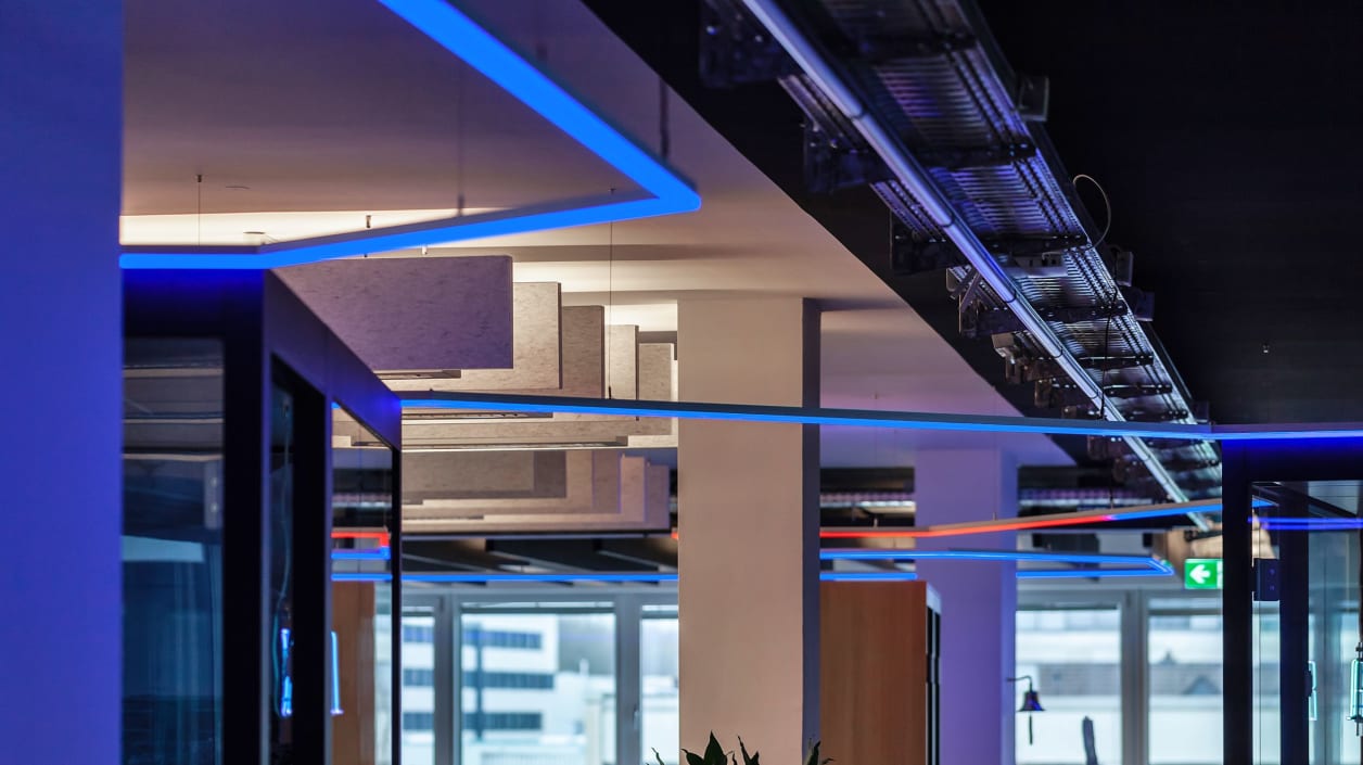 Volgens Guido Ebbert van het adviesbureau if5 reageert de interieurvormgeving in materiaal- en kleurkeuze alsook qua uiterlijk en gevoel op de contrastrijke corporate identity van het moederconcern: “Voor de kantoorruimten hebben wij bewust gekozen voor een rustige basisstemming, in de communicatiezones zijn stimulerende kleuren toegepast.” Annika Pointke van NetCologne vult aan: “Het designconcept van onze kantoorruimten sluit in meerdere opzichten aan bij onze bedrijfscultuur en ons corporate design. De kleuren komen overeen met onze merkkleuren en komen steeds weer terug in alle ruimten. Rood staat voor de band met de mensen in de regio en blauw voor onze technische affiniteit en innovatie. Ook de looproutes tussen de niet rechthoekig opgestelde THINK.TANKs zijn aangegeven met LED-lichtslangen in deze kleuren. Zij symboliseren het stadsspoor- en metrolijnennet. Als Keuls bedrijf hechten wij veel waarde aan regionaliteit. Onze besprekingsruimtes dragen namen van Keulse stadswijken en ook de visuele aankleding spreekt Keuls! De open kantoorruimten weerspiegelen onze hartelijke, open en communicatieve bedrijfscultuur, de creatieve zones onze flexibele en collaboratieve manier van werken.”