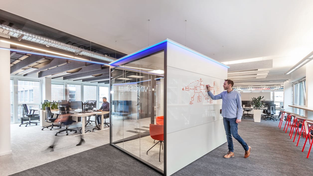 “Ons kantoorconcept biedt veel heerlijke plekken voor ontspanning, waar wij ook op afstand kunnen werken: met notebook en kopje koffie erbij goed voorbereid op de volgende werkbespreking in de geluiddichte en geventileerde THINK.TANK, of klaar voor de brainstormsessie in onze creatieve zone met beschrijfbare wanden.”