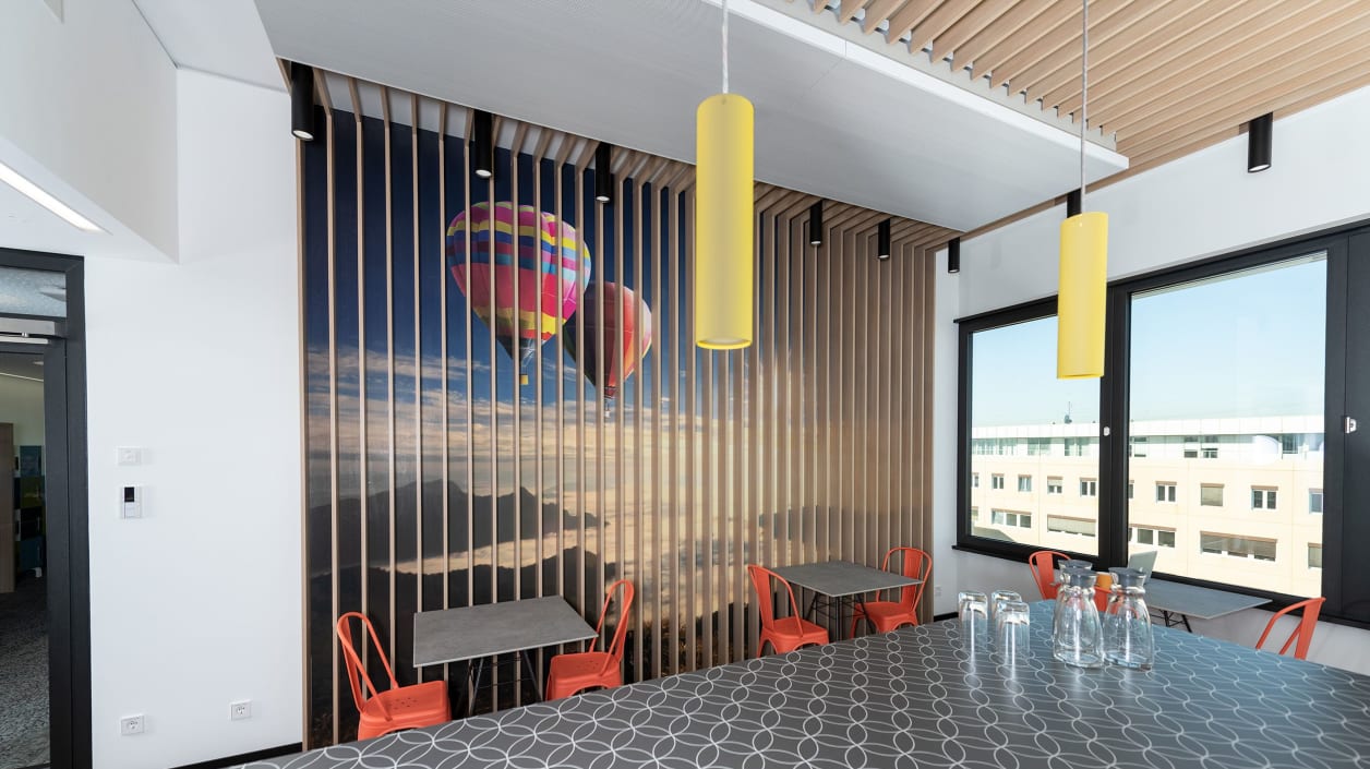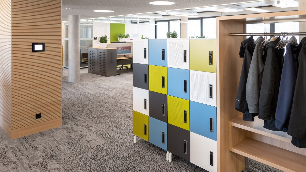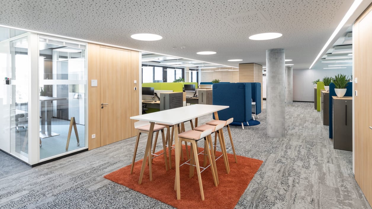 Het grondoppervlak van 27.400 vierkante meter wilde men ongewijzigd laten, aldus Matthias Kraus, afdelingshoofd Facilitair management, “zodat we geen extra vloerbedekking hoefden te leggen.” Het eerste deel van drie bouwfasen is nu klaar. De heldere vormen van het gebouw van zes verdiepingen, waarin veel glas zorgt voor optimale lichtomstandigheden, contrasteert met een bewuste combinatie van kleuren, vormen en materialen in het interieur. Als partner voor de nieuwe meubelconcepten koos men, evenals in het verleden, voor König + Neurath. “Wij gebruiken al heel lang K+N meubilair en zijn overtuigd van de kwaliteit, de flexibiliteit van de speciale opties en de prijs-kwaliteitverhouding”, aldus Kraus.